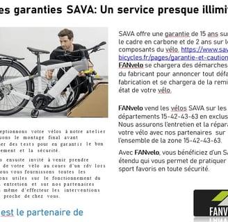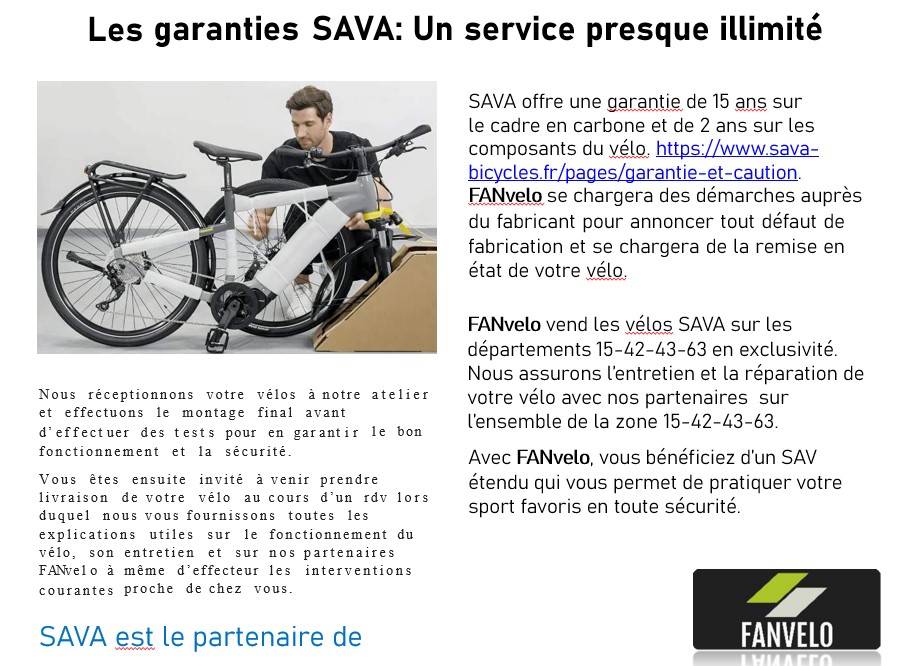 FANvelo assure en exclusivité avec ses partenaires la vente et la réparation des vélos SAVA sur le département 15-42-43-63 Haute-Loire.